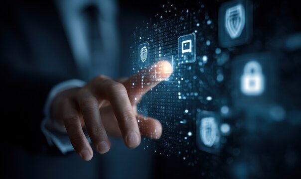 Hand touching futuristic digital security icons floating in the air, with a dark blue background. The hand is blurred in the background