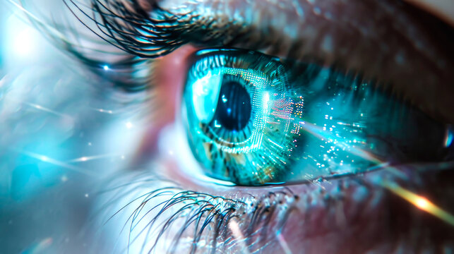 Close-up of a human eye with futuristic digital data and light effects reflecting, symbolizing technology, innovation, and augmented reality concepts