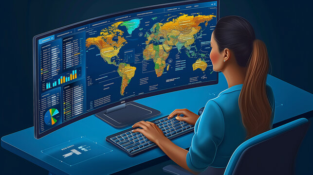 A Businesswoman Interacts with a Futuristic Digital World Map, Planning and Analyzing International Data, Generative AI