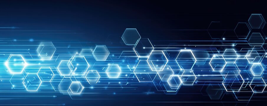 Abstract digital technology background with glowing hexagonal shapes and lines.  Dynamic and futuristic design with light blue elements on a white background
