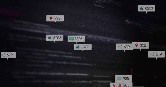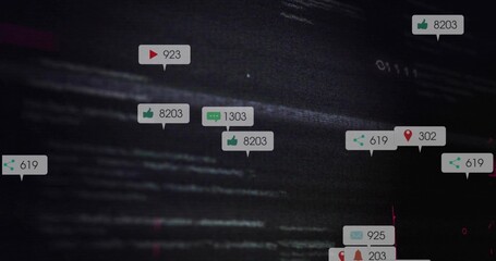 Floating likes, comments and metric icons glitching across dark digital interface, with code static