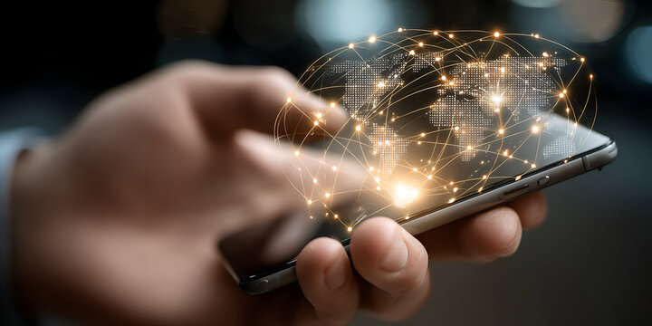 Smartphone hand digital network connection technology communication global internet data wireless mobile device futuristic
