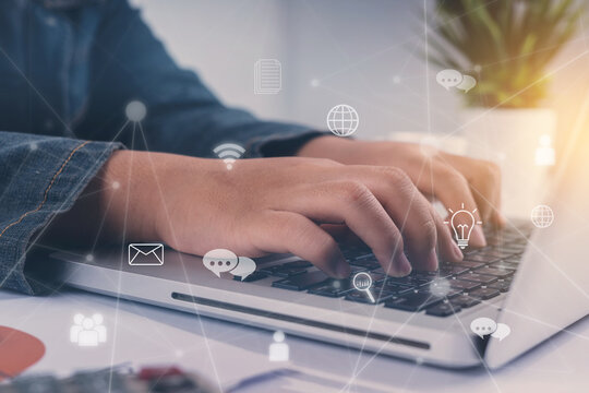 Hands typing on a laptop firewall cyber security by AI and digital icons. Depicts technology, innovation, and futuristic concepts. digital transformation themes.
