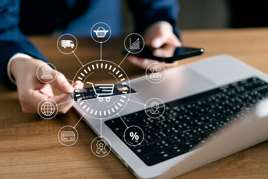 Businesswoman payment via credit card shopping online with cart icons with a virtual interface shipping global network connection, digital marketing, marketplace, online shopping, e-commerce concept.