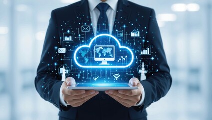 Businessman holding a tablet displaying a glowing cloud computing interface with digital data and network connections
