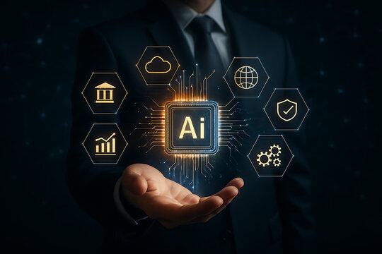 Businessman presenting artificial intelligence ai chip with cloud graph internet banking shield and gear icons in futuristic digital interface