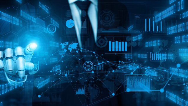 A businessman engages with a digital interface showcasing various graphs and charts. The blue tones and robotic elements emphasize a futuristic technological environment. Xenic