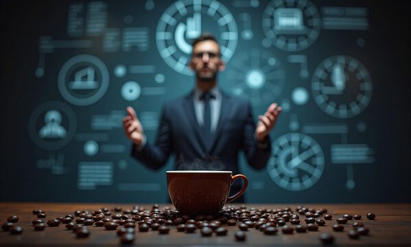 A steaming cup of coffee and scattered beans on a desk, with a blurred business professional presenting against an illuminated futuristic data display.