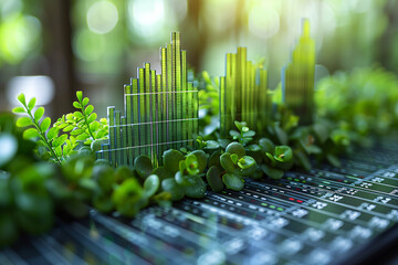 Eco-friendly concept depicted by rising bar charts in varying shades of green among lush foliage, symbolizing growth and sustainability in business