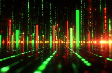 Displaying red 3D bars and red line tracing downward on digital dashboard with green binary overlay