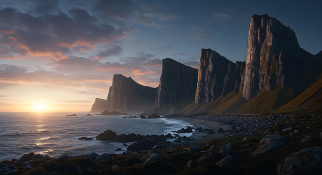 Futuristic digital interface cascading over twilight beach