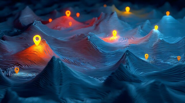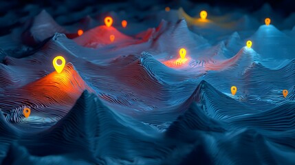 Illuminated location markers highlight peaks across a dark, undulating digital landscape.