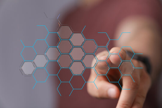 Abstract hexagon pattern, finger pointing, futuristic technology, network connection, innovation, digital interface, modern design, data v