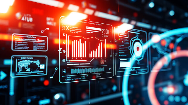 Futuristic digital dashboard interface with holographic data charts