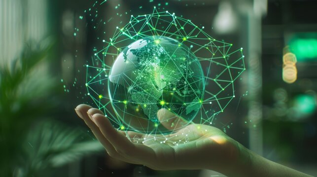 A holographic figure sitting in a hand, symbolizing innovation and digital art.