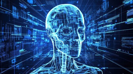 Futuristic digital interface with human head hologram