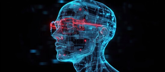 Holographic wireframe human head in profile wearing glowing red glasses with neon blue circuitry and red data nodes on a dark background, futuristic contemplative mood