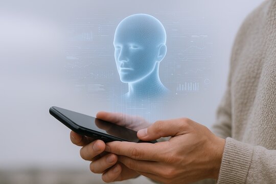 Futuristic digital interface with hologram of human head and modern smartphone.