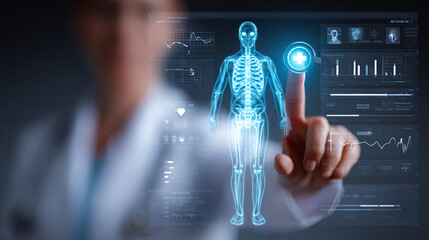 Medical professional interacting with digital human anatomy interface, showcasing advanced healthcare technology. Data visualization and diagnostics are key.