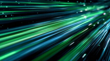 Abstract depiction of flowing green and blue digital light streams moving rapidly into the distance