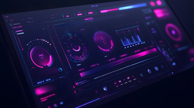 Digital dashboard with glowing, vibrant elements. Multiple displays show various data points, gauges, and graphs.  Dark background accentuates the glowing UI