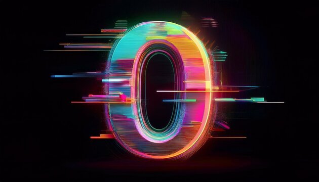 Digital Glitch: Neon Number Zero. A vibrant and futuristic number zero with a glitch effect, set against a dark backdrop. The image exudes energy and a sense of dynamism.