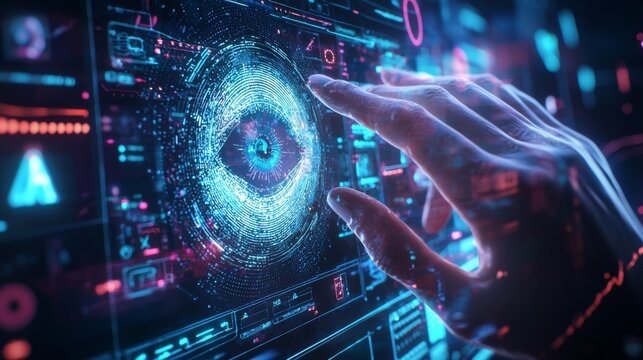Futuristic Biometric Scanning : A concept image of a human hand or eye being scanned by a biometric security system, showing futuristic interface elements, scanning lines, and data output