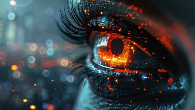 eye reflects digital technology and a futuristic cityscape, symbolizing AI's role in shaping urban life.