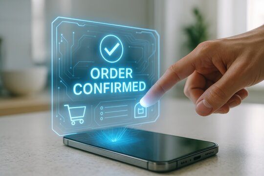 Digital confirmation message on smartphone screen with glowing holographic display.