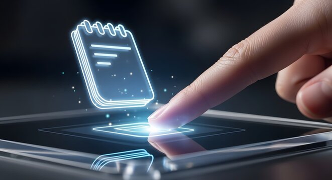 Finger interacting with a glowing digital receipt or invoice on a futuristic tablet interface