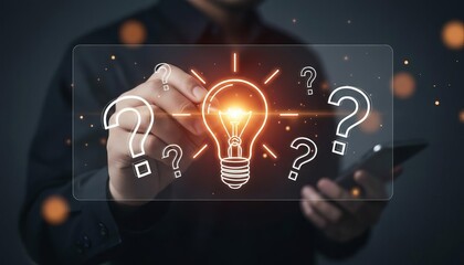 Problem-solving and creative idea generation: Hand touching a glowing lightbulb among question marks on a virtual screen
