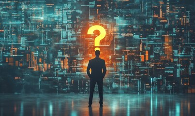 Professional businessman's hand interacting with a glowing question mark on a futuristic virtual interface, representing inquiry and seeking solutions.