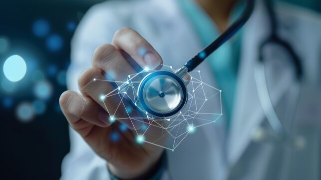 Doctor hand with stethoscope and Ui icon medical in hospital with medical technology network concept. Generative AI