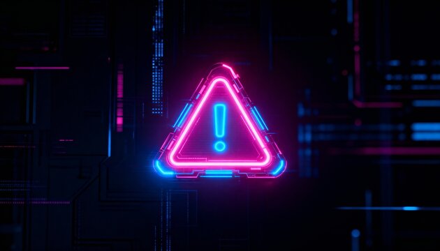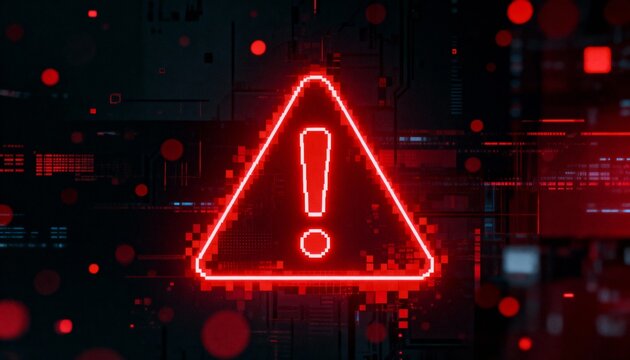 A virus alert warning displayed on a digital screen with red danger symbols and glitch effects, in a futuristic environment