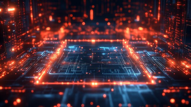 Abstract digital circuit board with red glowing lines and blue accents.