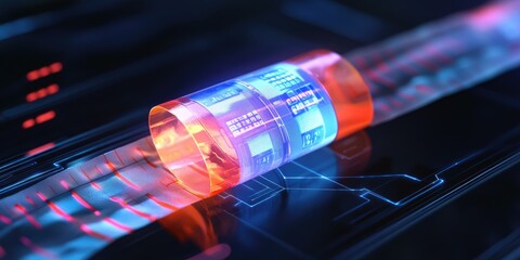 Blue and red glowing cylinder on black surface.