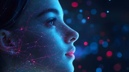 woman face is illuminated by digital networks and glowing lights, symbolizing AI powered innovation and hyper personalization in technology