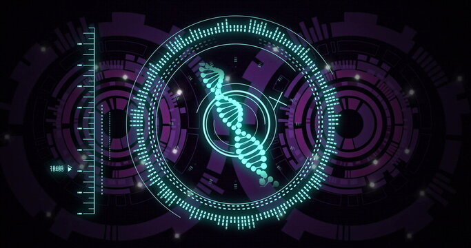 Rotating turquoise DNA helix swirling in grid interface, showing data bars, code labels and barcode
