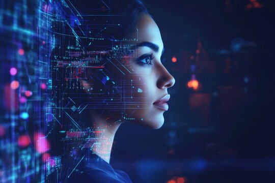 Woman's profile illuminated by digital data against a dark background creating a futuristic atmosphere