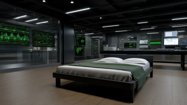 Dark Science Lab Setting with Bed and Digital Screens and Sleek Modern Design