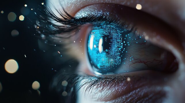 Close up of a futuristic eye with digital interface.