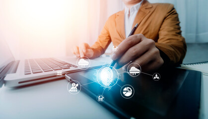 Fingerprint Biometric Digital Scan Technology. Graphic interface showing man finger with print scanning identification. Concept of digital security and private data access by use fingerprint scanner.