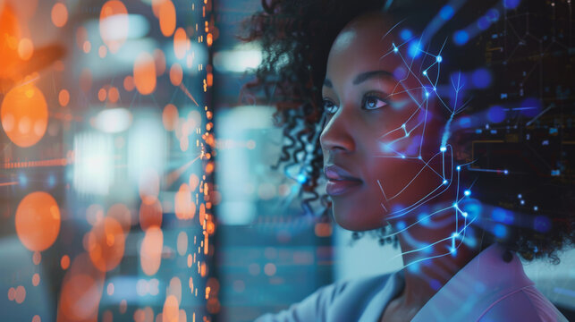 The woman's face is surrounded by a digital grid, biometrics, face control. Woman's face on computer screen with blue background