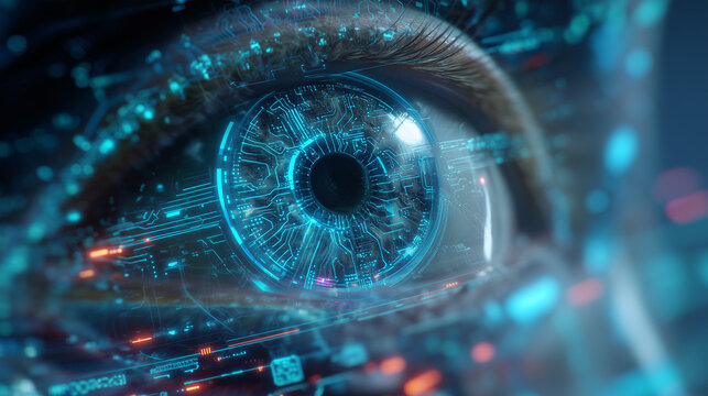 Close-up of a human eye with digital and technological elements overlaying, symbolizing AI, data, and futuristic vision.