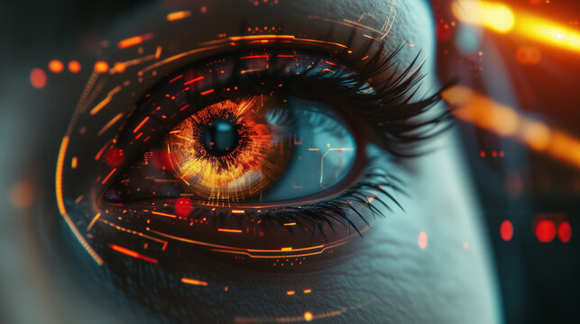 A close-up image of a human eye overlaid with futuristic digital graphics representing concepts of technology and data visualization.