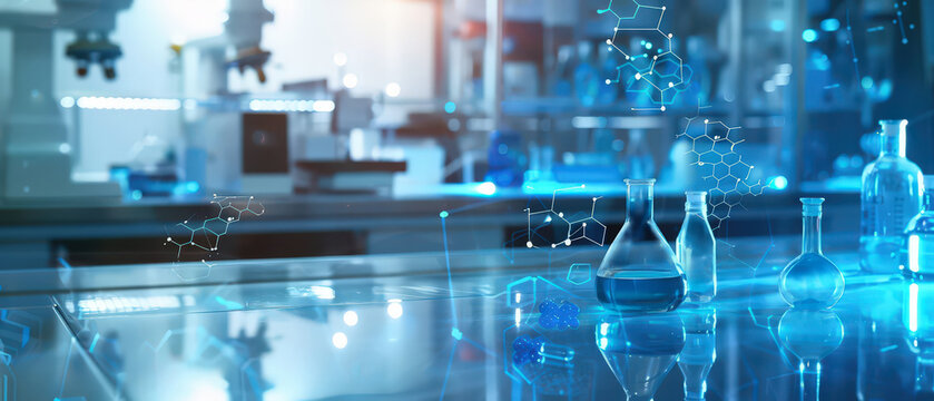 Futuristic laboratory scene with glass bottles, neon lighting and digital interface overlays, creating a modern scientific atmosphere with technology, research and innovation elements.