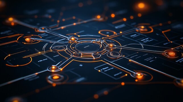 Abstract digital network concept with glowing nodes and connections in a dark background, representing technology, data flow, and communication systems for futuristic design.