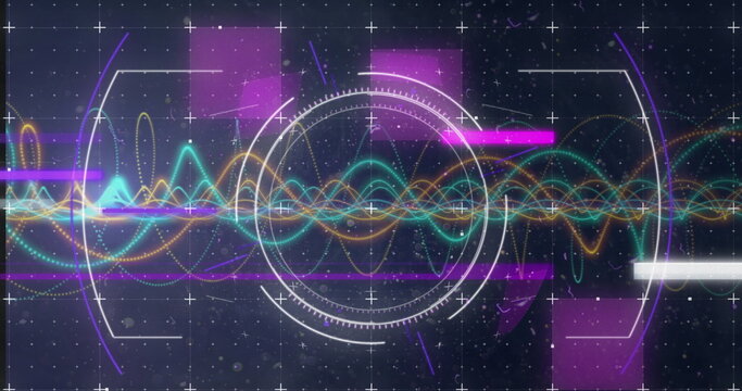 Image of digital icons and scopes scanning over abstract shapes