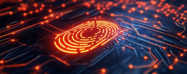Digital fingerprint emerges from swirling data vortex on tablet above complex circuit board symbolizing biometric security and digital identity concepts