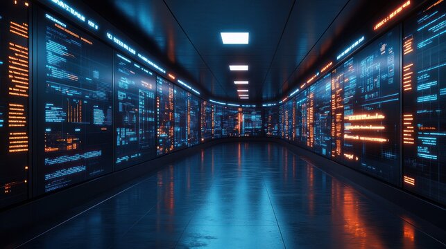 Advanced data center corridor filled with glowing servers and digital displays showing intricate code and data streams in vibrant orange and blue